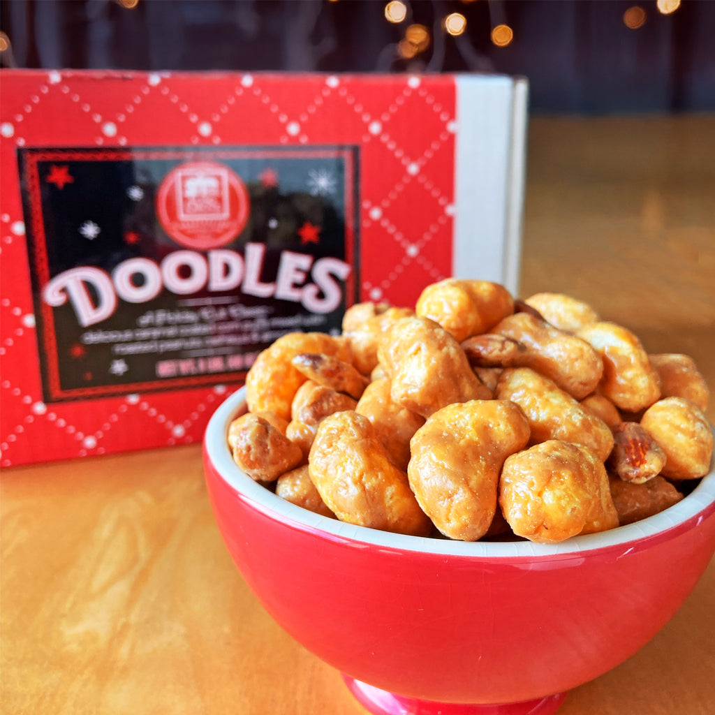 The Holiday Cult Candy... highly addictive! 3 Lbs. of crunchy nuts, puffed corn, lots of butter cooked in a copper kettle with just the right amount of sweetness… insanely good. Doodles are exclusively sold by Long Grove Confectionery. Made only for the holiday season.*Not Kosher. PRE-ORDERS start October 1st. SHIPPING starts DECEMBER
